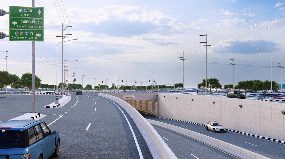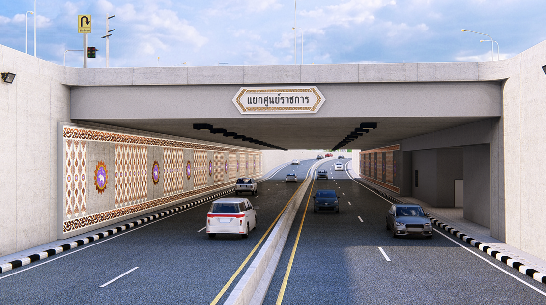 รูปแบบทางเเยกบริเวณเเยกศูนย์ราชการ รูปเเบบเส้นทางบริเวณจุดเริ่มต้นทางลอดเเยกศูนย์ราชการ รูปแบบทางลอดเเยกศูนย์ราชการ